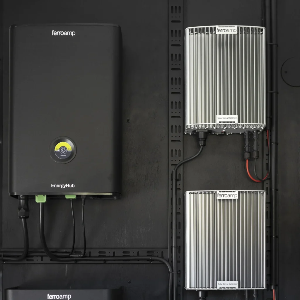 Ferroamp-systemets EnergyHub är en intelligent och effektiv växelriktare till solcellerna och bidirektionell omvandlare till ett batteri. Likströmsnätet minimerar omvandlingsförlusterna och ger maximal styrbarhet.